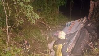 El camionero tuvo que ser excarcelado por efectivos de Bomberos del Servicio de Emergencias del Principado de Asturias (SEPA) con base en los parques de Tineo y Cangas del Narcea. La cabina, donde quedó atrapado, estaba muy deformada por lo que la excarcelación resultó dificultosa. Tras iluminar la zona y asegurar el camión con el cabestrante del vehículo de primera salida de bomberos se procedido a bajar el material de rescate e iniciar la descarcelación. En primer lugar se retiró la puerta de la cabina y una vez que se abrió hueco se sacó al herido, inmovilizado con collarín, con la tabla de rescate. Mientras se realizada la operación de rescate otra parte de la dotación de bomberos procedió a abrir una vía de evacuación, con herramientas manuales, dado que la zona donde había caído el camión estaba rodeada de maleza. Una vez liberado, se trasladó al herido a una camilla nido y con ayuda de un sistema de cuerdas se le subió hasta la carretera donde le esperaba el equipo sanitario.