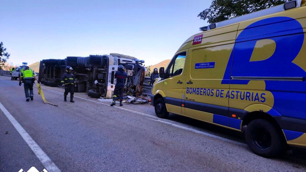 El Centro de Coordinación de Emergencias del 112 Asturias recibió el aviso a las 07.04 horas. En la llamada indicaban que había volcado un camión que transportaba forraje. El conductor, señalaban, estaba atrapado.