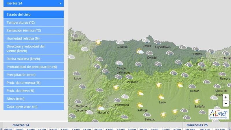 La Agencia Estatal de Meteorología prevé para hoy, martes, día 24 de mayo de 2022 en Asturias cielos nubosos o cubiertos de nubes bajas y nubosidad de evolución durante el día, con lluvias y chubascos que serán más probables y abundantes en zonas de montaña. Cota de nieve entre 1400 y 1600 metros. Brumas matinales en el interior que podrán aparecer de nuevo al final.