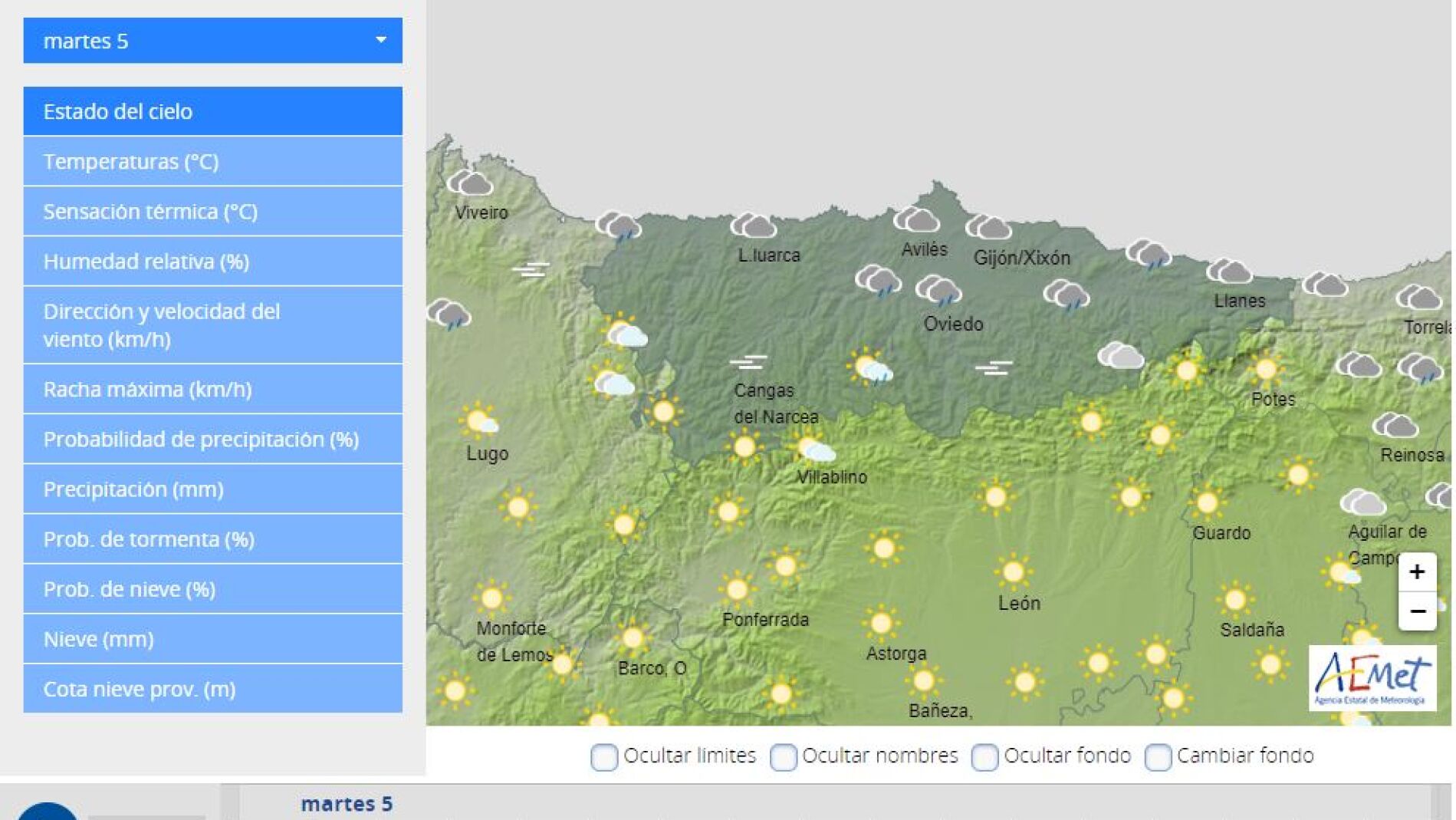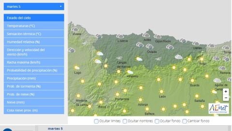 La Agencia Estatal de Meteorología prevé para hoy, martes, día 5 de julio de 2022 en Asturias cielo nuboso o cubierto de nubes bajas. Brumas y bancos de niebla en el interior. Lluvias débiles y dispersas y, por la tarde, chubascos que podrían ir acompañados de tormenta. Temperaturas sin cambios o en ligero ascenso. Viento del nordeste flojo, más intenso en la costa.