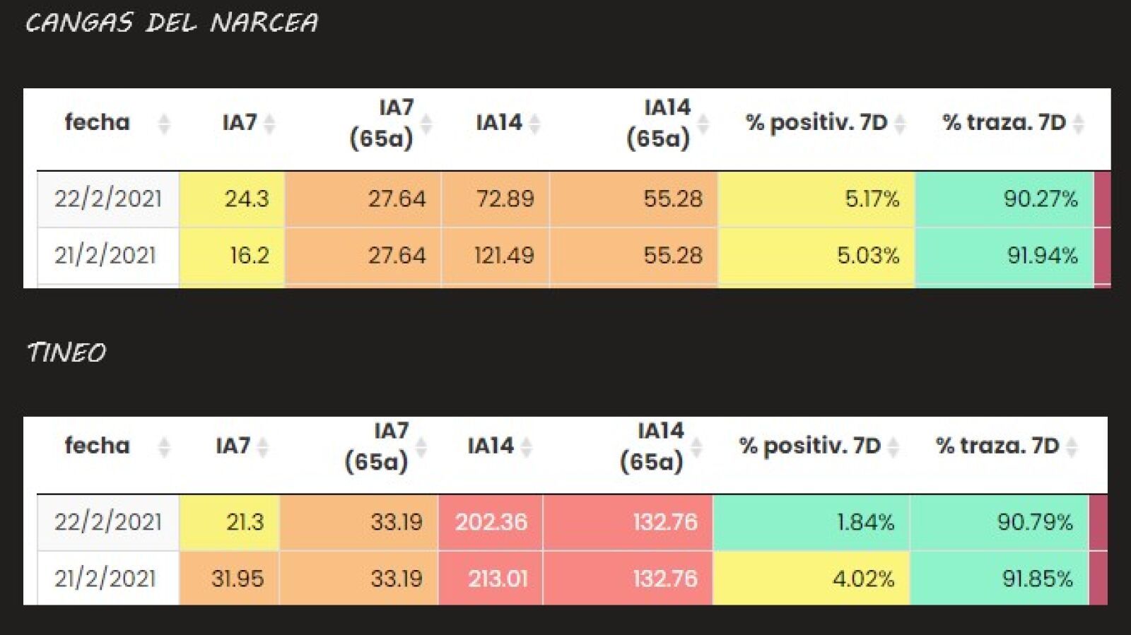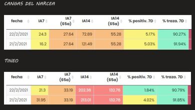 - En Cangas del Narcea ha bajado la IA14d a 72´89 casos x 100.000 habitantes, eso ha sido al dejar fuera del cómputo de los 14 días el 8 de febrero, fecha en la que se contabilizaban 7 casos.