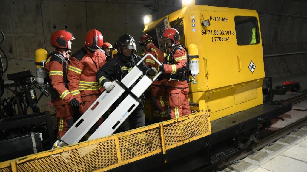 En el ejercicio de emergencia, un tren de mercancías se ha quedado inmóvil por un conato de incendio dentro del túnel. Los maquinistas han intentado sofocarlo y uno de ellos ha resultado herido con heridas de diversa consideración.