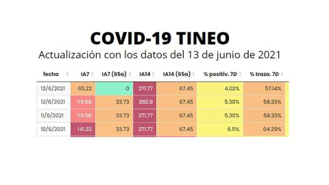 A fecha 13 de junio son 25 los casos activos en éste municipio, lo que eleva la IA 14d a 271 casos por 100.000 habitantes. Además se aprecia una bajada en la Positividad hasta el 4,02% y en la Trazabilidad, hasta el 57%. El Nivel de Alerta Global es de 1 (amarillo).