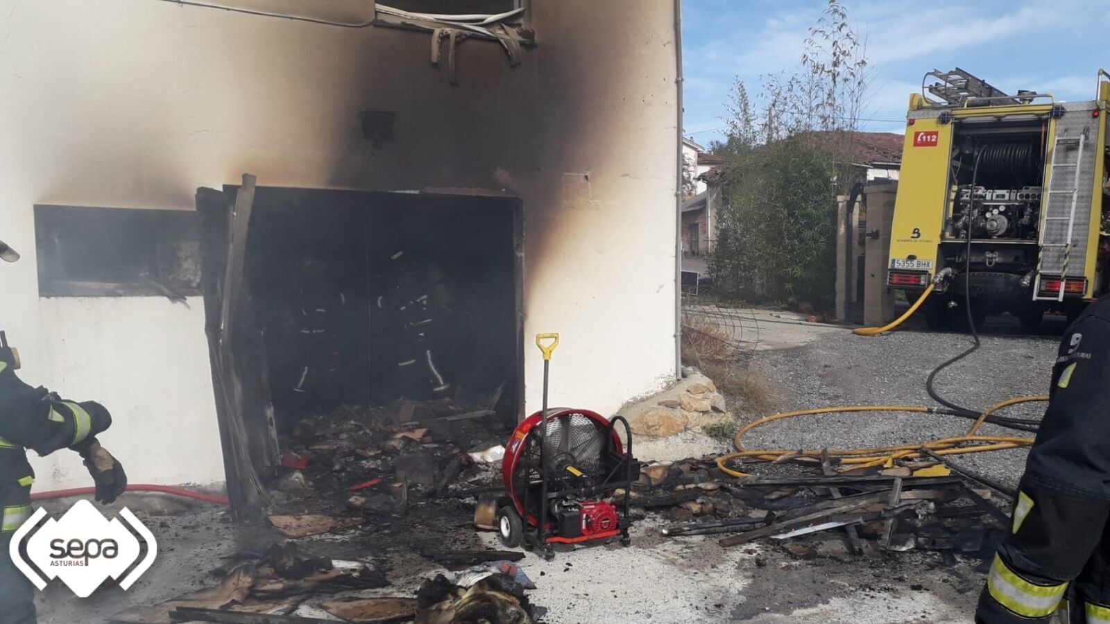 Efectivos de Bomberos del Servicio de Emergencias del Principado de Asturias (SEPA) con base en los parques de Villaviciosa, Cangas de Onís y Piloña, junto al jefe de zona del oriente, han extinguido el incendio declarado en el bajo de una vivienda de dos alturas, donde se ubicaba una carpintería, en Camás, Cabranes.