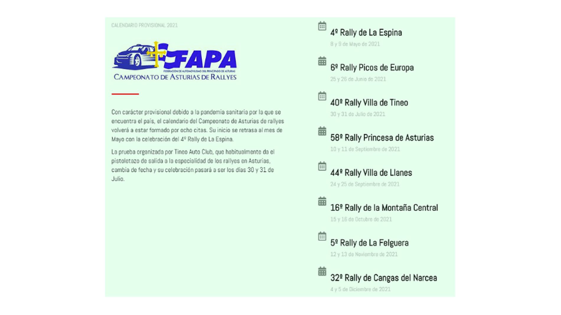 FEDERACIÓN DE AUTOMOVILISMO DEL PRINCIPADO DE ASTURIASCalendario provisional del Campeonato de Asturias rallyes para el 2021