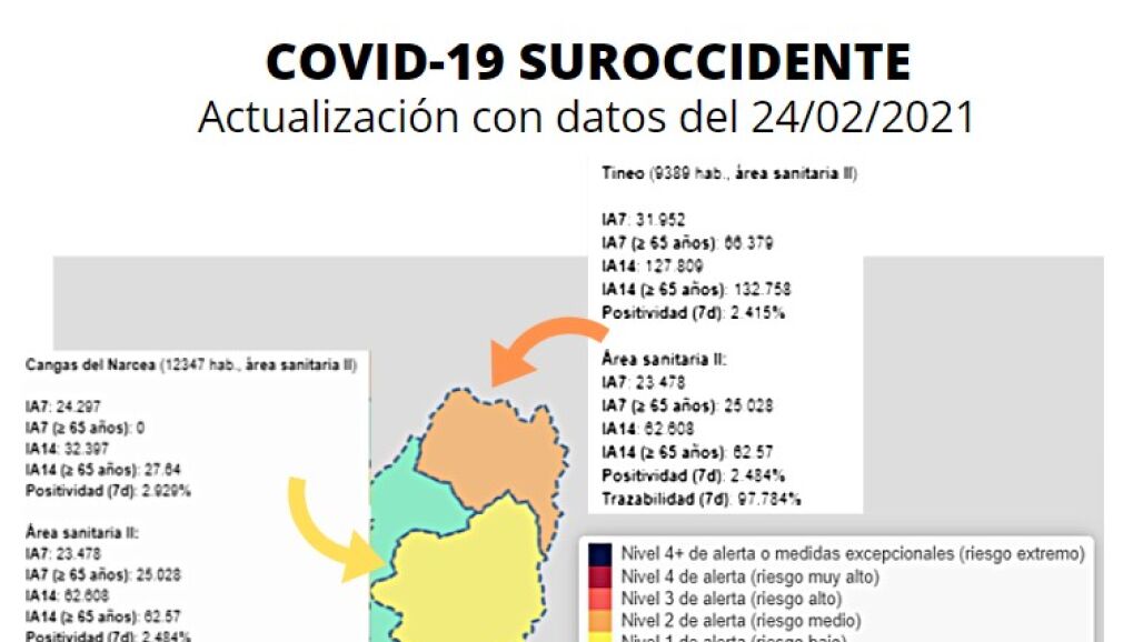 El último positivo se confirmó el miércoles 24 de febrero en Tineo, de esta forma son 12 los casos activos en este concejo, de ellos 3 en los últimos 7 días.