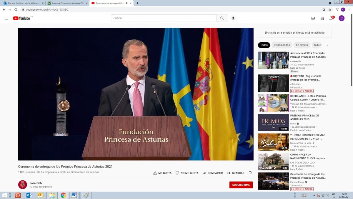 La pandemia ha protagonizado el discurso de SM el Rey en Oviedo durante la entrega de los Premio Princesa de Asturias 2021. Felipe VI ha comenzado su intervención refiriéndose a los cambios a los que nos ha obligado el Covid 19, tuvo un recuerdo para las víctimas , precisó que las vacunas constituyen la mayor esperanza para vencer el virus mostró su convencimiento y puso su mirada en los sanitarios, instándonos a seguir su ejemplo de “fuerza y coraje para seguir adelante”.