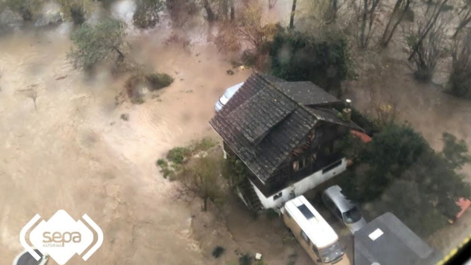 El Grupo de Rescate del SEPA, a bordo del helicóptero medicalizado, ha rescatado, en colaboración con Bomberos del SEPA del parque de Piloña, a tres personas de una vivienda que ha quedado rodeada por el agua en la recta de Lleu, en la fina de El Llerón, en el propio concejo piloñes. En concreto se ha evacuado a tres personas, un matrimonio y su hijo de 7 años y a un perro. Para llevar a cabo la intervención se realizaron cinco ciclos de grúa, de entre 35 y 40 metros, con el helicóptero de bomberos.