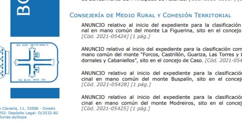 La Consejería de Medio Rural y Cohesión Territorial publica éste martes 8 de junio de 2021 en el BOPA anuncios relativos al inicio del expediente para la clasificación como vecinal en mano común de cuatro montes: La Figuerina en Allande; Buspalín, Modreiros y Rebollosa en Tineo.