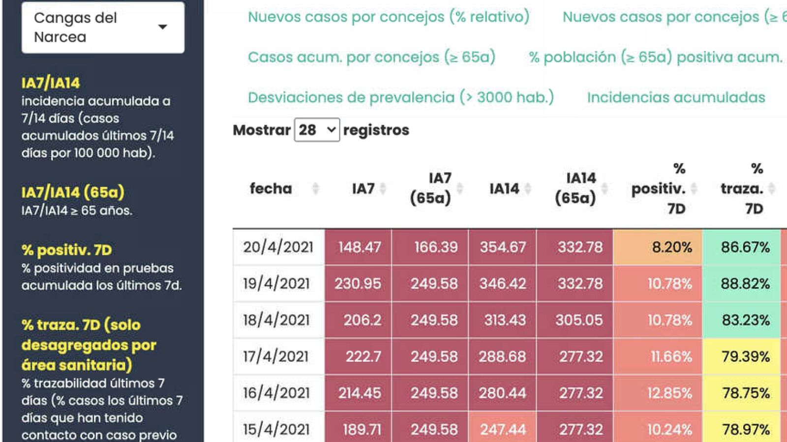 - Sigue el incremento de IA14 en Cangas del Narcea, que no entra en 4+ por su alta trazabilidad, aunque se espera un descenso pronunciado en los próximos días tras el descenso de la IA7 (1 caso hoy) y bajar su positividad acumulada del 10%.