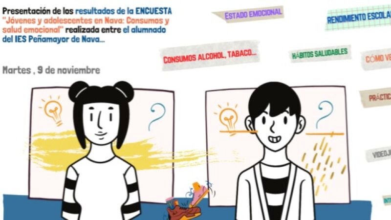 Esta tarde, a partir de las 18:30 h. en la casa de Cultura de Nava, tendrá lugar una sesión informativa sobre consumos y salud emocional en jóvenes y adolescentes de Nava con la presentación de los resultados de la encuesta «Jóvenes y adolescentes en Nava. Consumos y salud emocional» realizada entre abril y mayo con el alumnado del IES Peñamayor de Nava.