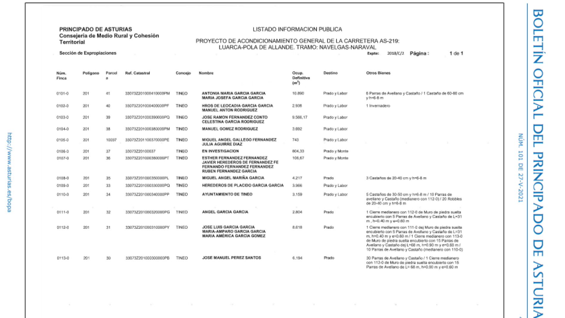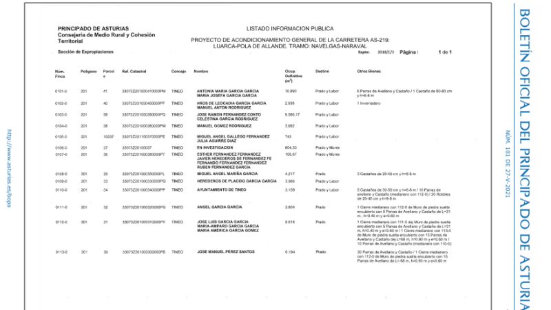 El BOPA de este jueves 27 de mayo de 2021 publica el acuerdo de 14 de mayo, del Consejo de Gobierno, por el que se declara la urgente ocupación de los bienes y derechos afectados por la expropiación necesaria para la realización de las obras correspondientes a la ejecución del proyecto de “Acondicionamiento general de la carretera AS-219. Luarca-Pola de Allande. Tramo: Navelgas-Naraval”