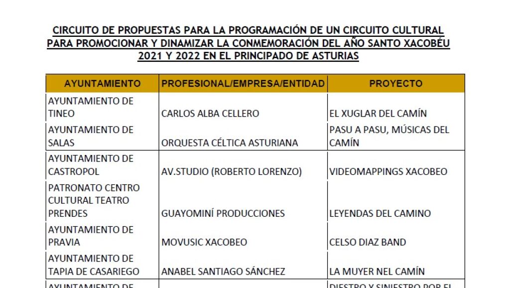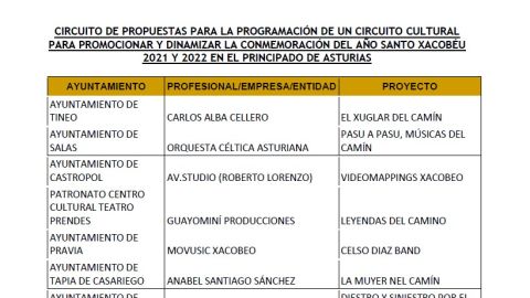 Carlos Alba Cellero presentó en Borres, Tineo, El Xuglar del Camín, una serie de historias, leyendas, cuentos, romances y coplas cantadas al son del rabel sobre el Camino Primitivo, mientras que Anabel Santiago llevará a Tapia de Casariego La muyer nel Camín, con el fin de divulgar el cancionero popular de las rutas jacobeas a través de la óptica femenina y a través de diferentes géneros musicales.