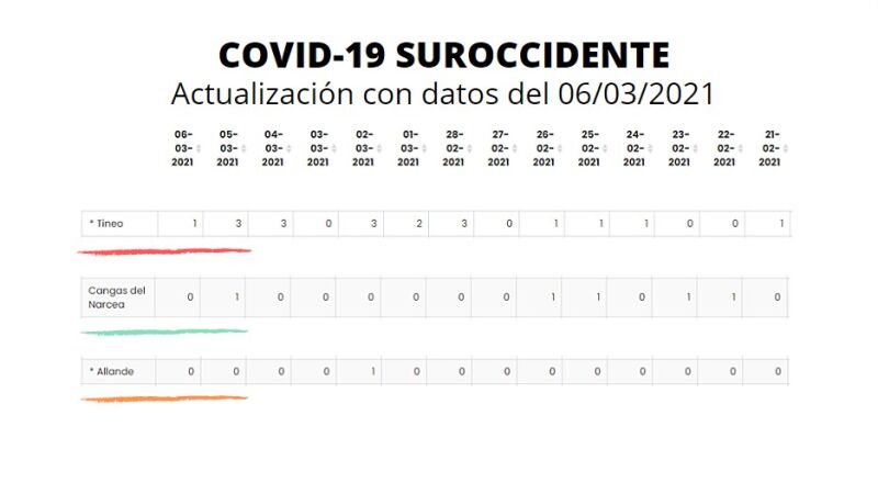 - En Cangas del Narcea se acumulan 5 casos en 2 semanas, 1 de ellos en los últimos 7 días, con lo que la Incidencia: 40 casos por 100.000 habitantes en los que respecta a la general, y cero casos para los mayores de 65 años, le sitúan en Nivel de Alerta 0= ´Nueva Normalidad´.