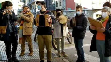 La banda de gaites LaKadarma ha querido mantener viva la tradición del Aguilandu en Infiesto. Fue este sábado, con una salida que se dividió en una sesión de mañana y otra de tarde, para recorrer los comercios, calles y bares, recuperando cantares de antaño, en muchos casos de origen local, y que aún se mantienen en la memoria de unos pocos.