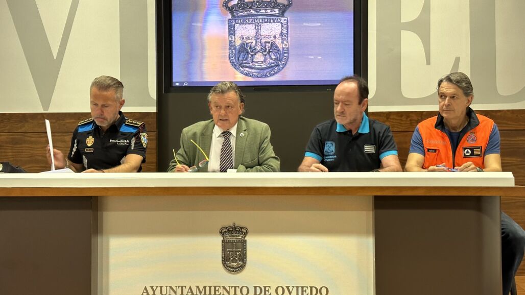 El concejal de Seguridad Ciudadana, José Ramón Prado; el Comisario Principal Jefe de la Policía Local, Javier Lozano; el jefe del SEIS, Luis Díaz Montes; y el responsable de Protección Civil en Oviedo, Gonzalo Míguez, han presentado este jueves el dispositivo de seguridad para las Fiestas de San Mateo que, al igual que el año pasado, contará con un protocolo de actuación ante la sospecha de sumisión química.