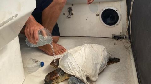 Los alumnos de la Escuela de Vela han participado en las labores de rescate, ayudando a subirl a la tortuga a bordo e hidratándola en todo momento, mientras el patrón se ponía en contacto con el 112 para que acudieran lo antes posible a llevarla a manos de expertos.