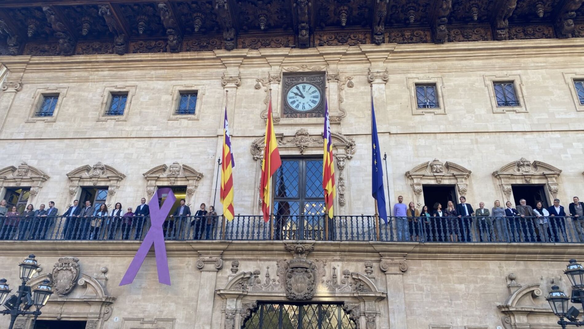 El alcalde de Palma, José Hila, junto a otros miembros de la corporación municipal y representantes de diferentes entidades que luchan por los derechos de las mujeres, ha colgado este jueves un gran lazo lila en el balcón del Ayuntamiento para conmemorar el 25-N, que se celebra este viernes.
