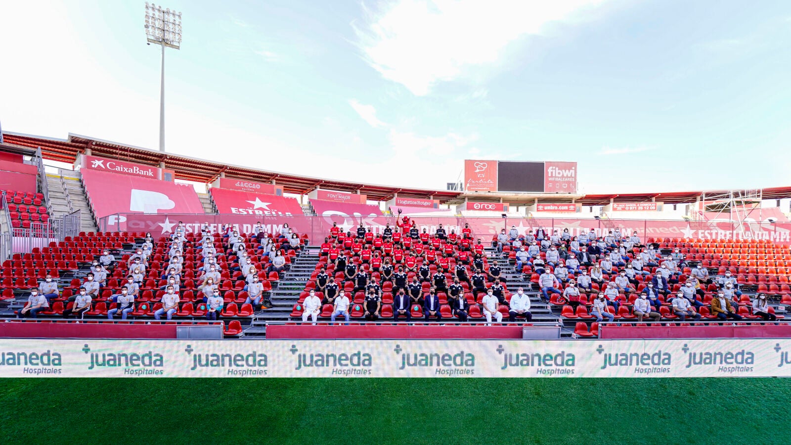 Además de abonados, staff técnico y plantilla, cinco sanitarios de Juaneda Hospitales, patrocinador oficial del RCD Mallorca, han integrado la primera línea como reconocimiento a su trabajo durante la pandemia del COVID-19.