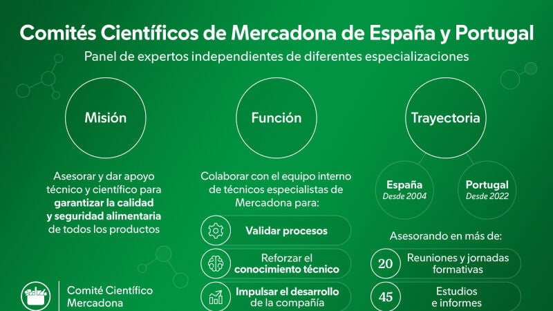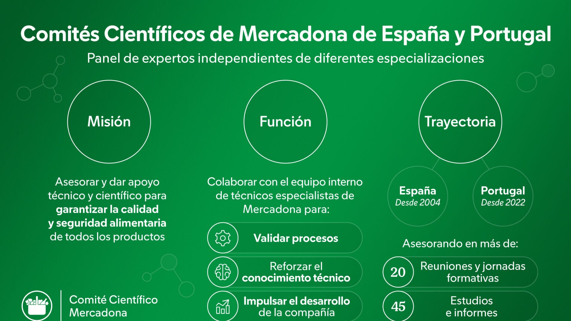 Estos “comités de sabios”, formados por científicos de diferentes especializaciones, prestan formación, información, apoyo técnico y asistencia científica en distintas especialidades, con el objetivo de garantizar la máxima calidad con seguridad alimentaria en los procesos y productos de la compañía. En lo que respecta a la composición de ambos Comités Científicos, a los científicos mencionados se suman, en España: José Juan Rodríguez, doctor en veterinaria y experto microbiólogo (Universidad Autónoma de Barcelona); Ana Canals, doctora en Ciencias Biológicas (Universidad Complutense de Madrid); Arturo Anadón, doctor en Veterinaria (Universidad Complutense de Madrid); Andrés Otero, doctor en Veterinaria (Universidad de León); Andreu Palou, doctor en Bioquímica (Universidad de Islas Baleares); Juan José Badiola, doctor en Veterinaria (Universidad de Zaragoza) y actual presidente del Comité; Pilar Vinardell, doctora en Farmacia (Universidad de Barcelona) y José Miguel Mulet, doctor en Bioquímica y experto en Biología Molecular (Universidad Politécnica de Valencia). Integran el Comité Científico de Mercadona en Portugal: Alexandra Silva, experta en Ciencias Farmacéuticas (Facultad de Farmacia de Lisboa), Paula Teixeira, experta en Microbiología y doctora en biotecnología (Universidad Católica Portuguesa), Fernanda Vilarinho, doctora en Ingeniería de los Materiales (Instituto Superior Técnico de la Universidad de Lisboa), Sandra Chaves, doctora en biología (Universidad de Lisboa), Inês Pádua, doctora en Ciencias de la Nutrición (Universidad de Porto) y Duarte Torres, doctor en Ciencias e Ingeniería Química y Biológica (Universidad de Porto).