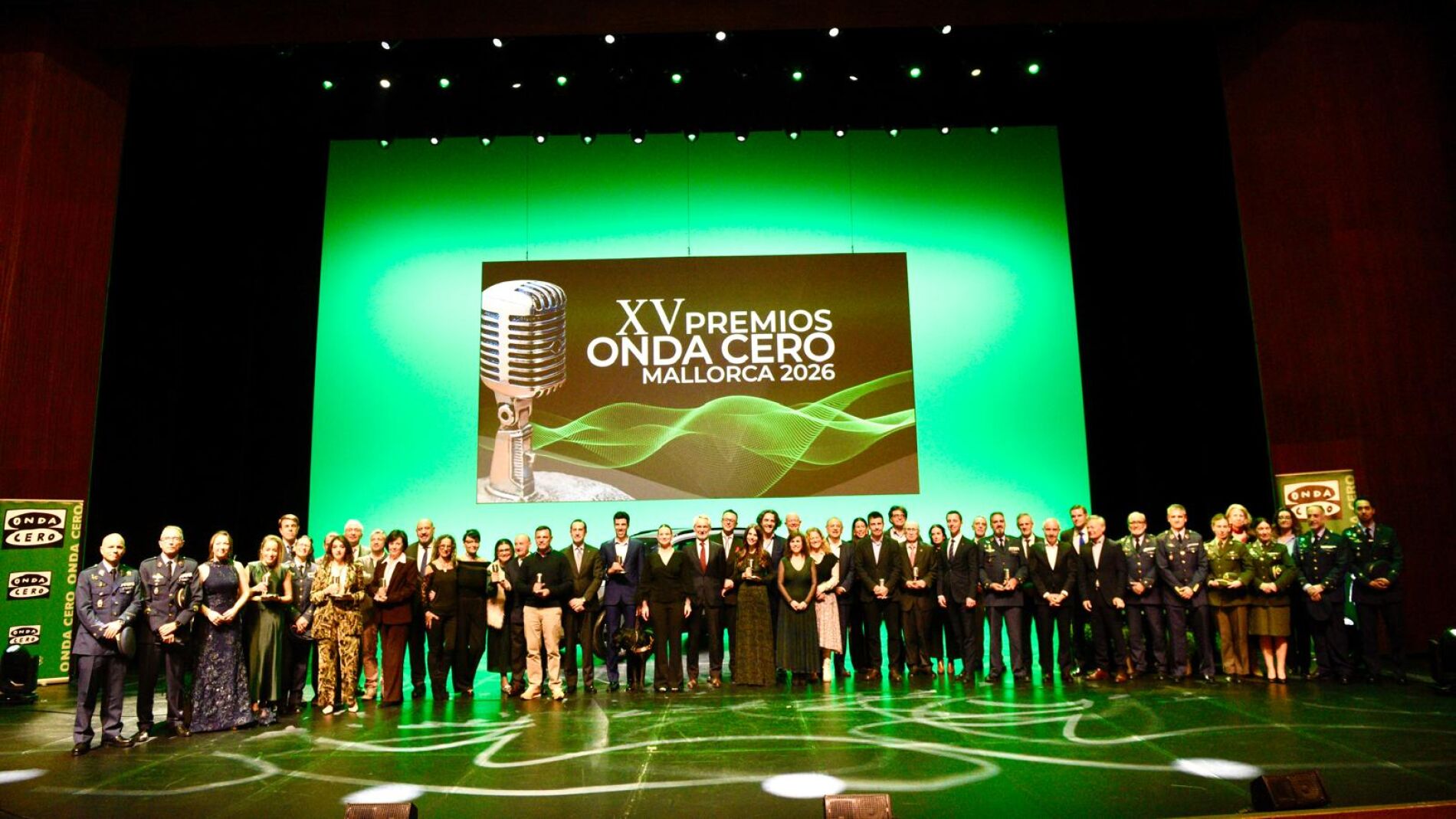 La gala de entrega de estos decimoquintos galardones ha terminado con el Premio Onda Cero Mallorca de Honor que no siempre entrega la emisora y que este año ha sido compartido por una multitud de representantes del Ejército del Aire y del Espacio, en representación de la Base Aérea de Son San Juan, en su 75 aniversario.