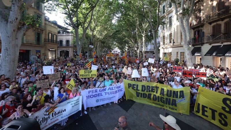 Miles de personas --unas 30.000, según datos de la organización, y unas 8.000, según las cifras facilitadas por Policía Local y Policía Nacional-- han salido este domingo a las principales calles de Palma, en una manifestación que ha sido convocada por la plataforma Menys Turisme, Més Vida, de manera coordinada con diferentes ciudades del sur de Europa, y que ha tenido lugar de manera simultánea en Ibiza, para "denunciar la turistificación de las islas".