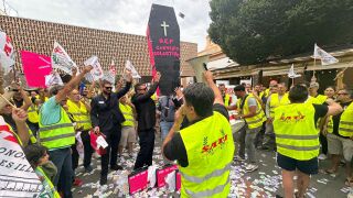 La huelga indefinida del TIB ha comenzado este viernes con una concentración de más de un centenar de trabajadores en la entrada de la estación intermodal de Palma en la que han escenificado una "imitación" de los empresarios con un ataúd con la frase "DEP convenio colectivo".
