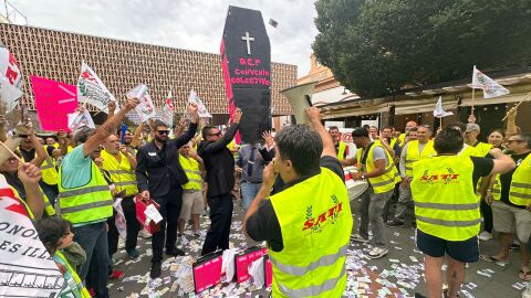 Con tambores, timbales y pancartas de 'Trabajadores del TIB en la lucha por un convenio digno' los trabajadores han iniciado la protesta, que han culminado con una 'performance' de los empresarios, escenificando un ataúd con la frase "DEP convenio colectivo" y maletines con dinero.