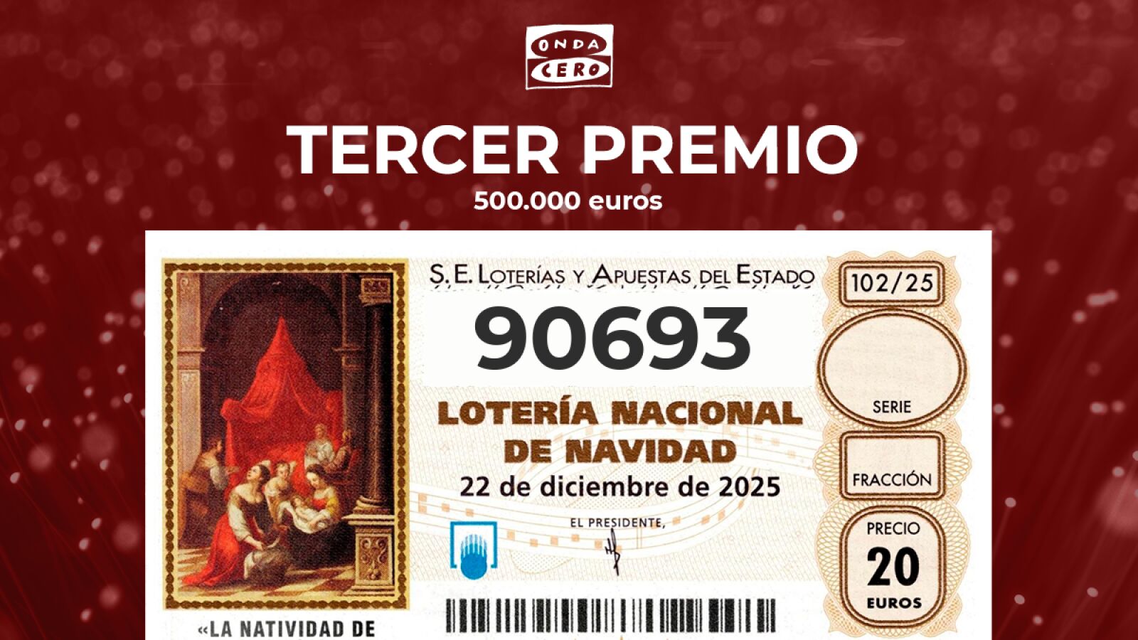 El número fue cantado a las 11.12 horas en el cuarto alambre de la quinta tabla. Los premios del Sorteo Extraordinario de Navidad 2025 se comenzarán a abonar desde la tarde del 22 de diciembre, cuando finalicen tanto las verificaciones de los números extraídos como los procesos informáticos, como es habitual, y hasta el 23 de marzo de 2026.