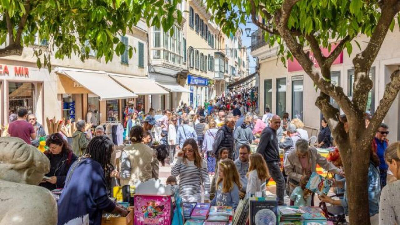Más de una treintena de paradas inundan las principales calles del centro de Maó para celebrar el día de Sant Jordi, donde los libros y las rosas son los artículos más demandados por residentes y visitantes.
