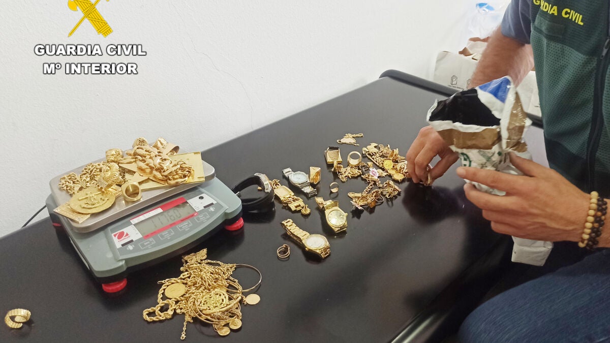 Tras los registros efectuados en seis domicilios, locales anexos y empresas, se han intervenido cerca de 100.000 euros en metálico, cinco armas de fuego y varias armas blancas, munición, diferentes cantidades de cocaína, hachís y marihuana, parte de ellas preparadas para su venta al menudeo, útiles necesarios para su dosificación, unos 2,5 kilos de joyas de oro, y diversa documentación para su análisis.
