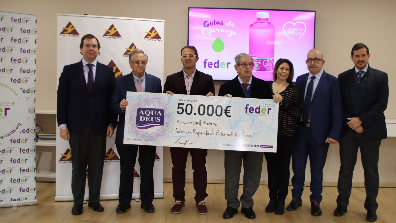 Aquadeus, empresa de agua mineral natural integrada en Grupo Fuertes, ha donado 50.000 euros a la Federación Española de Enfermedades Raras (FEDER) para ayudarles al fomento de la investigación de la búsqueda de diagnóstico y posibles tratamientos. En España se estima que existen más de tres millones de personas afectadas por algún tipo de dolencia poco frecuente.
