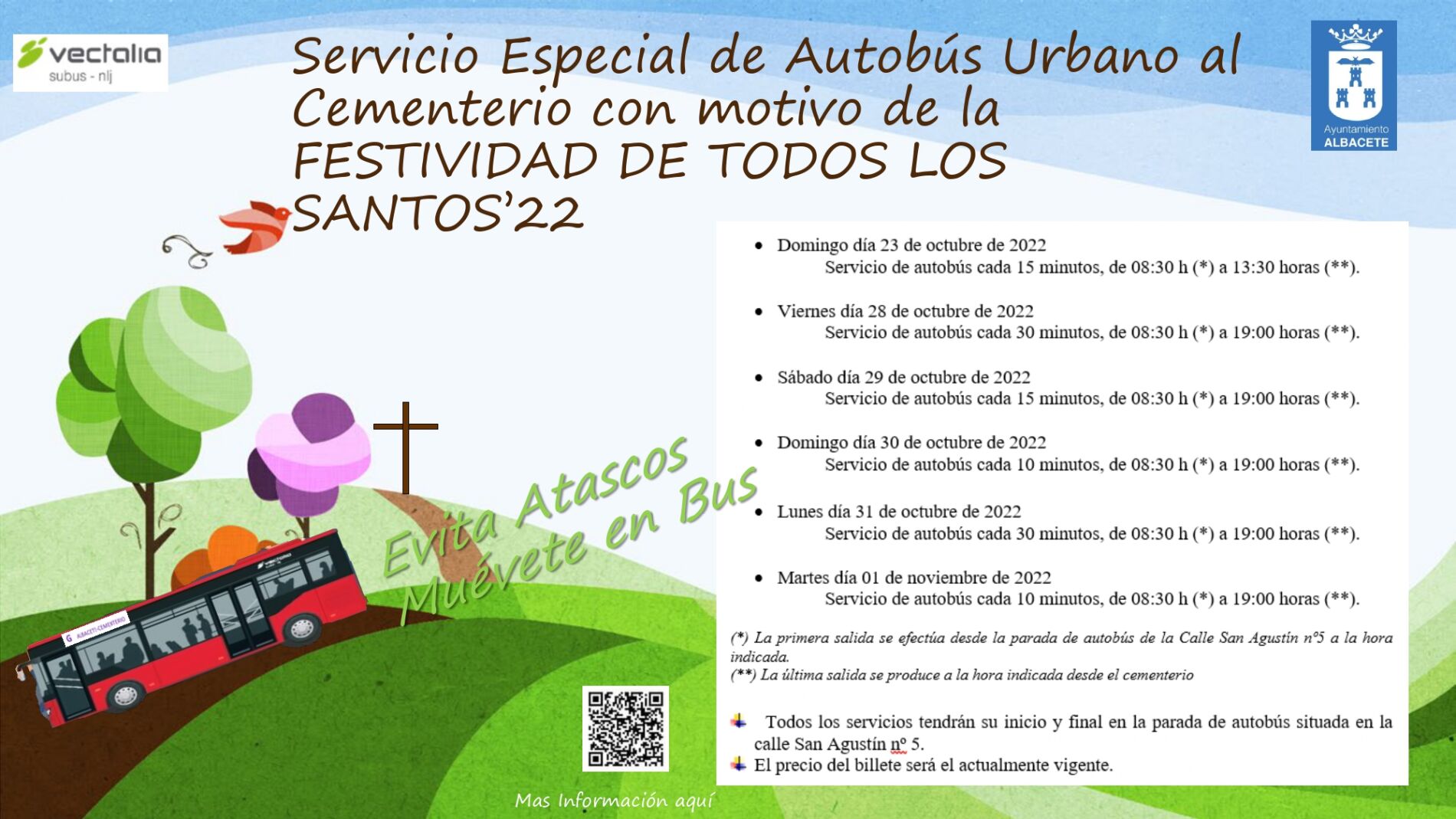En cuanto al servicio especial de autobús urbano, que parte desde la calle San Agustín nº5 hasta el Camposanto, Albaladejo ha detallado que arranca este domingo, 23 de octubre, con una frecuencia de 15 minutos de 8:30 horas a 13:30 horas. El viernes, 28 de octubre, el servicio de autobús será cada 30 minutos, de 8:30 horas a 19 horas; mientras que el sábado, 29 de octubre se prestará servicio cada 15 minutos de 8:30 horas a 19 horas.