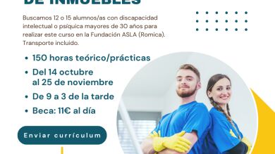 La Fundación ASLA está buscando 15 personas con discapacidad intelectual o psíquica de 30 años en adelante que quieran formarse en el sector de limpieza para impartir un curso de ‘Experto en limpieza de inmuebles’ que empieza el 14 de octubre y finaliza el 25 de noviembre.
