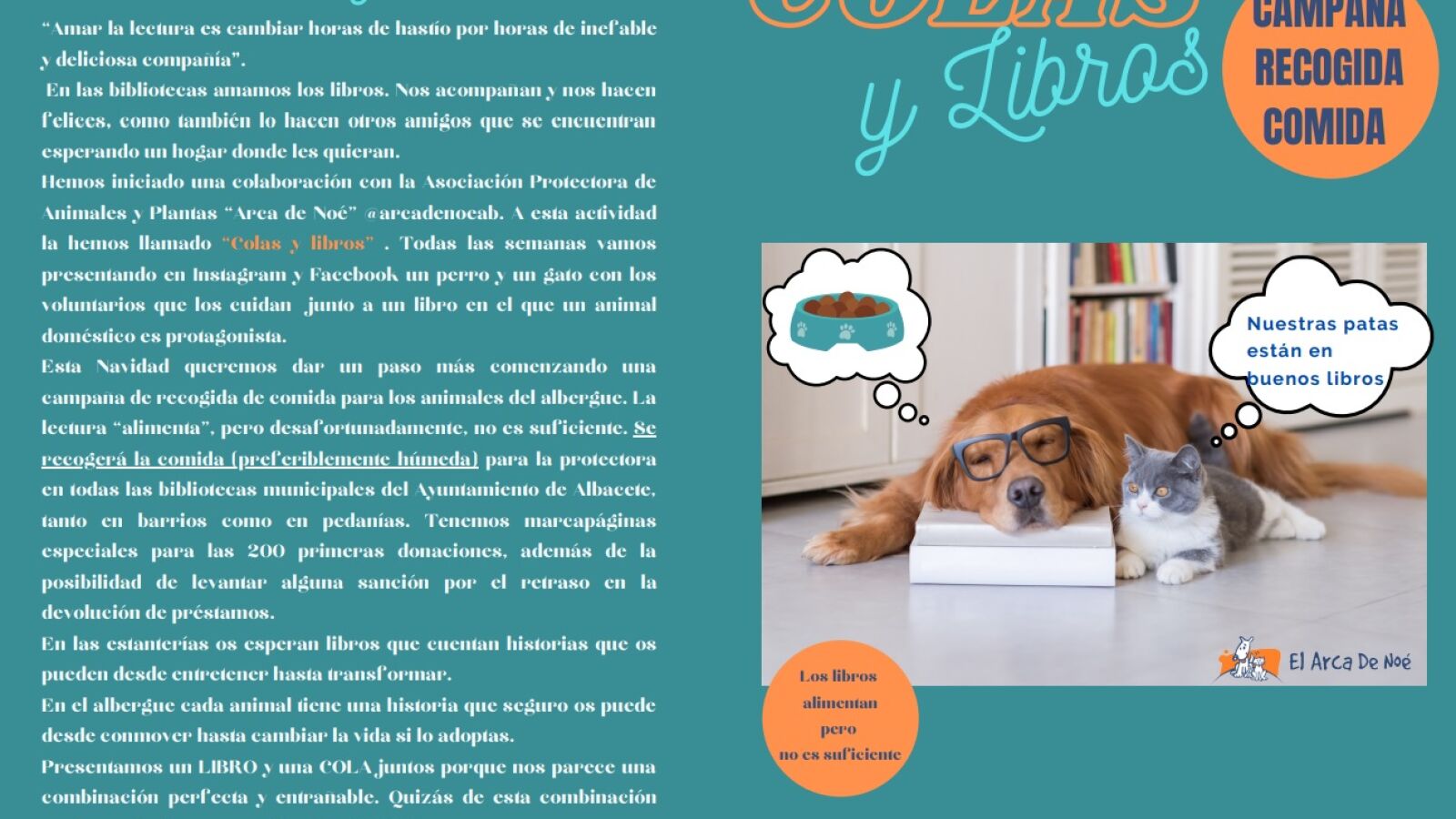 Cabe destacar que, desde finales de septiembre, cuando comenzara la campaña Colas y Libros, todas las semanas podemos ver en las cuentas de Instagram y Facebook de las Bibliotecas Municipales de Albacete (@rbmalbacete) una imagen de personas voluntarias junto a un perro o un gato diferentes, y que están a la espera de ser acogidos. En la fotografía también aparece un libro en el que un animal doméstico es protagonista, y es que, en las estanterías, los libros esperan para contar historias que pueden desde entretener hasta transformar.