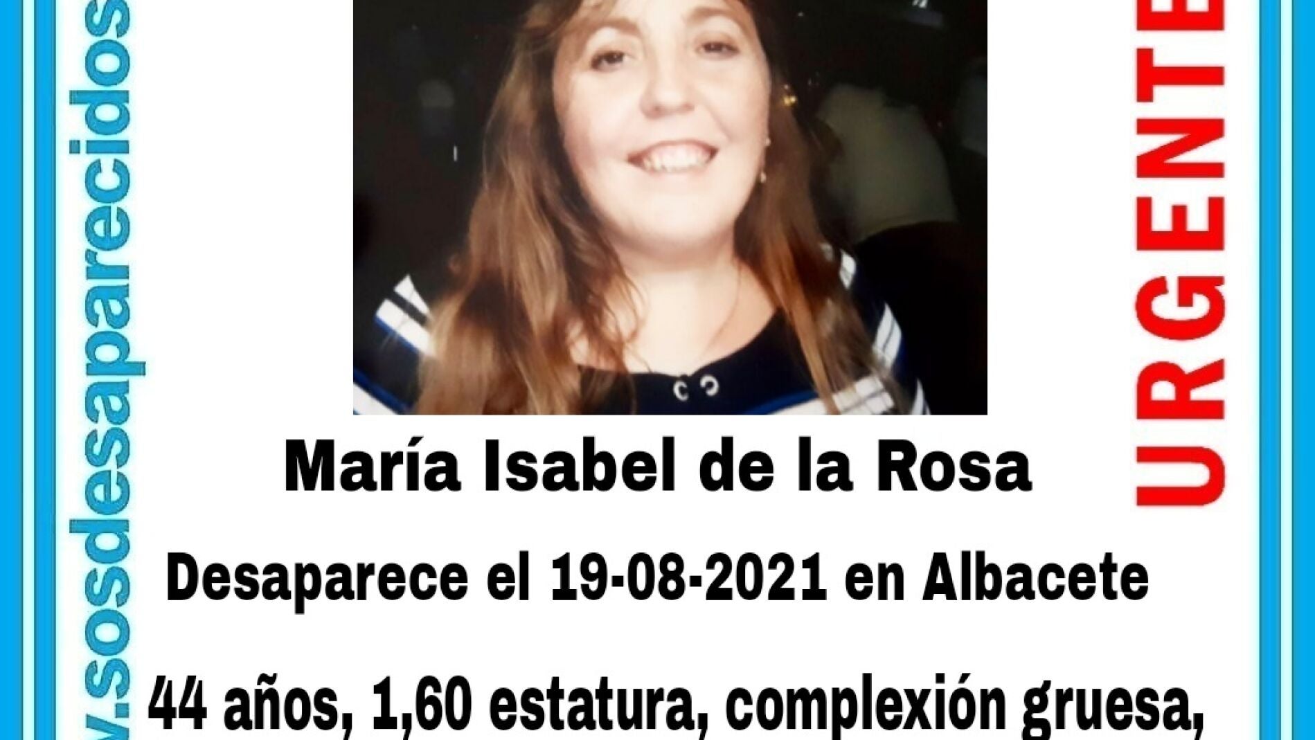 María Isabel de la Rosa tiene 44 años y trabaja como vendedora de la ONCE en la capital, sobre todo en la zona de Avenida de España y el Parque Abelardo Sánchez , donde es muy conocida y apreciada por la labor que desemplea. La asociación SOS Desaparecidos se ha hecho eco de la denuncia de la familia y ha realizado un hace un llamamiento para tratar de localizar a María Isabel de la Rosa , y ofrece una serie de datos para ayudar a identificarla: Mide 1,60 de estatura y pesa en torno a los 79 kilos. Es de complexión gruesa, tiene el pelo rubio y largo, y ojos castaños, además padece una cojera en la pierna derecha.