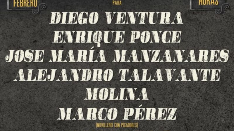 La empresa UTE Casas-Amador ha configurado este cartel para el 22 de febrero a las 16:30 horas, están anunciados el rejoneador Diego Ventura, los matadores de toros Enrique Ponce, José María Manzanares, Alejandro Talavante y Molina, el novillero con picadores Marco Pérez y el alumno de la Escuela de Tauromaquia de Albacete, Alejandro González. Se lidiarán reses de diferentes ganaderías.