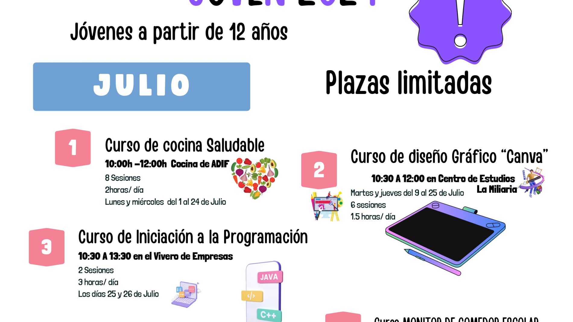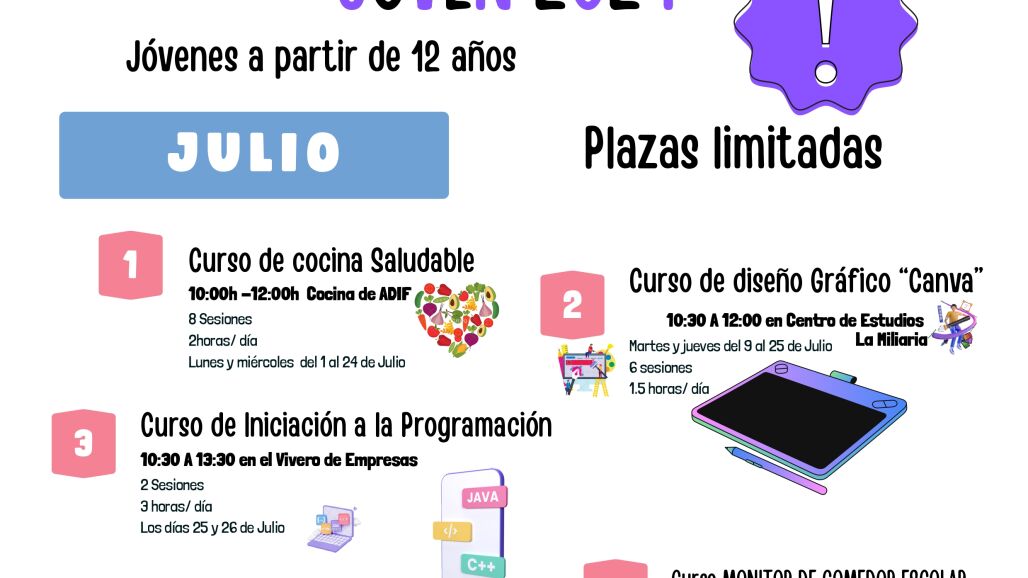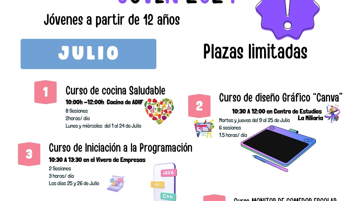 Durante el mes de julio, desde la concejalía de Juventud se han programado varias actividades dirigidas a jóvenes de la localidad a partir de 12 años. El objetivo de estas actividades, como ha señalado su responsable, Juan José Carrilero, es “fomentar un ocio saludable y de utilidad” para los jóvenes de la localidad durante sus vacaciones estivales y por ello se han programado cinco cursos y talleres de diferentes temáticas, “para que todos los jóvenes que estén interesados puedan realizarlos” durante el próximo mes de julio.