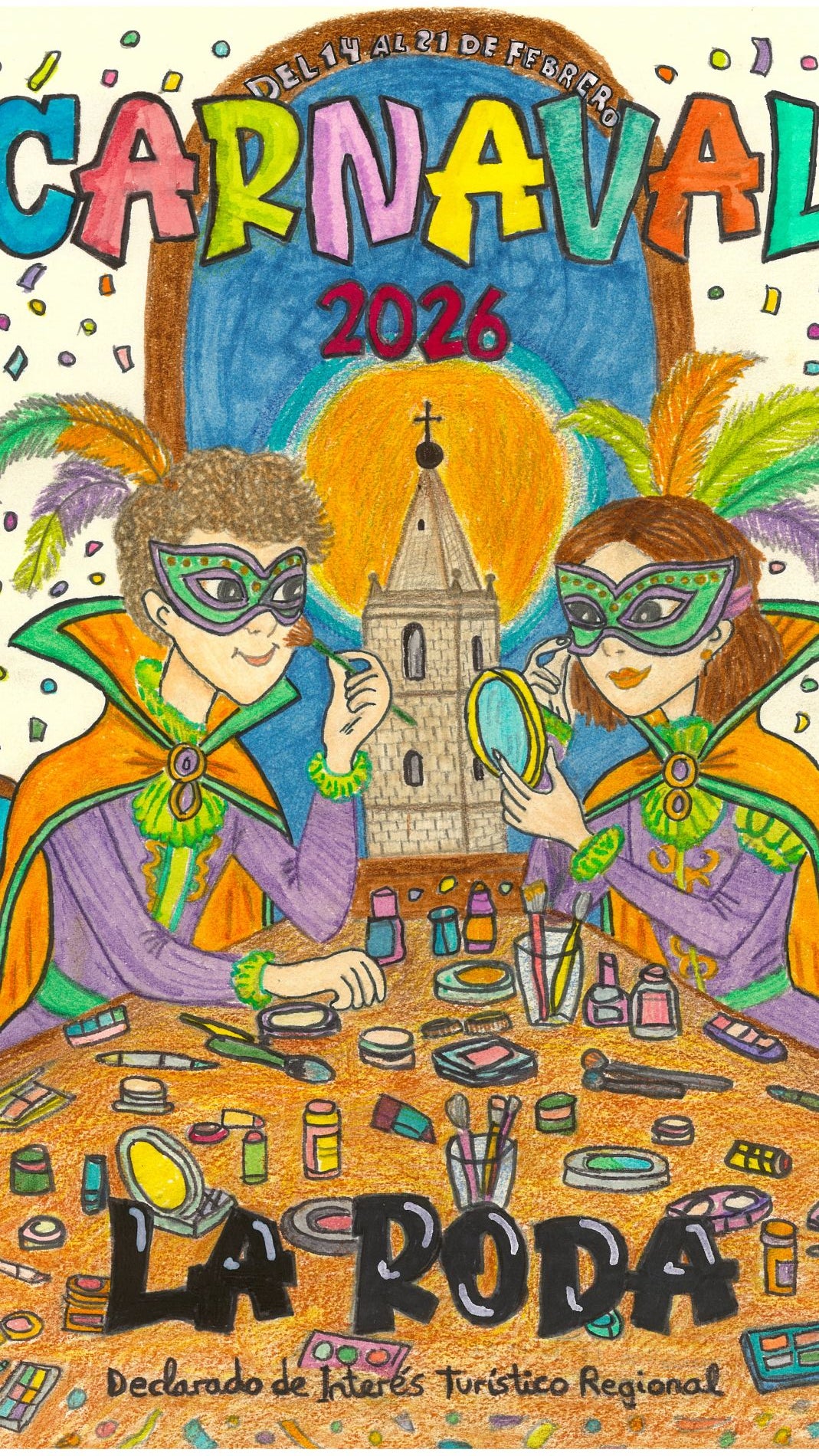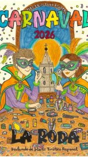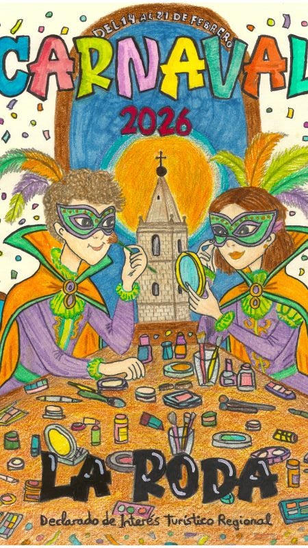 Por otro lado, se ha dado a conocer el cartel oficial del Carnaval de La Roda 2026, cuya forma de elección ha sido también este año una novedad, ya que ha sido elegido mediante un concurso en el que ha participado alumnado de los institutos de educaciósecundaria de la localidad, con el objetivo de “fomentar la creatividad artística y la implicación de los más jóvenes en la vida cultural del municipio”, según ha señaló Fernández. La elección se llevó a cabo el pasado 23 de enero tras valorar un total de 17 trabajos representativos de todos los IES de La Roda. El jurado estuvo compuesto por dos representantes del Ayuntamiento, dos profesores de Plástica de los institutos locales y dos miembros de la Asociación Amigos del Carnaval.Tras un proceso de selección en varias fases, el jurado decidió por unanimidad que el cartel ganador fuera el presentado por Natalia del Carmen Carrilero Moreno, alumna de 2º A de ESO del IES Doctor Alarcón Santón, cuya obra ilustrará la portada del programa oficial de actos del Carnaval 2026. Asimismo, se concedió una Mención Especial a la obra presentada por Eva Arenas Martínez, alumna de 3º D del mismo centro educativo.