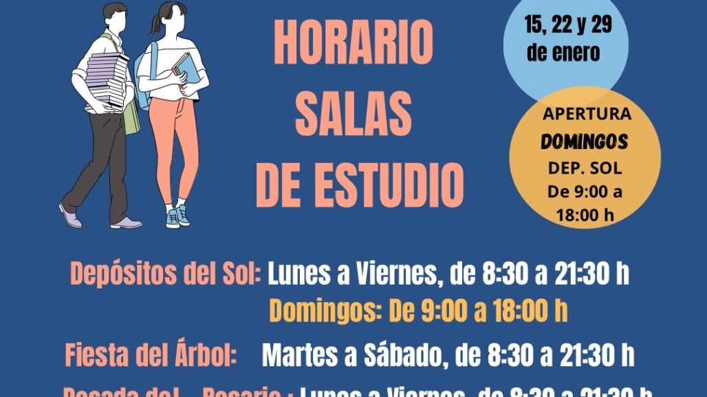 El Ayuntamiento de Albacete abrirá la Sala de Estudio de los Depósitos del Sol los tres domingos de enero, los días 15, 22 y 29, en horario de 9:00 a 18:00 horas, con el objetivo de ampliar los espacios y cubrir la demanda en época de exámenes.