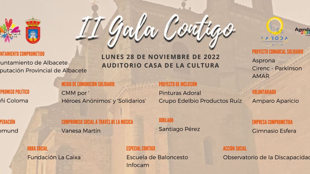 La 'II Gala Contigo', de La Roda, premiará a diecinueve colectivos, entidades y personas vinculadas con el ámbito social esta tarde, a las 19:30 horas,en la Casa de la Cultura del municipio rodense. La entrada será libre hasta completar aforo y, entre otros galardones, destaca el de la cantante Vanesa Martín por su compromiso social a través de la Música, "en referencia a su canción 'Soy', un símbolo en la lucha contra el cáncer"; CMM por sus programas 'Héroes Anónimos' y 'Solidarios' en la categoría de medio comunicación implicado o el Domund que recibirá el premio a la Cooperación y los Premios Especiales que recaerán en la Escuela de Baloncesto y el Plan Infocam.