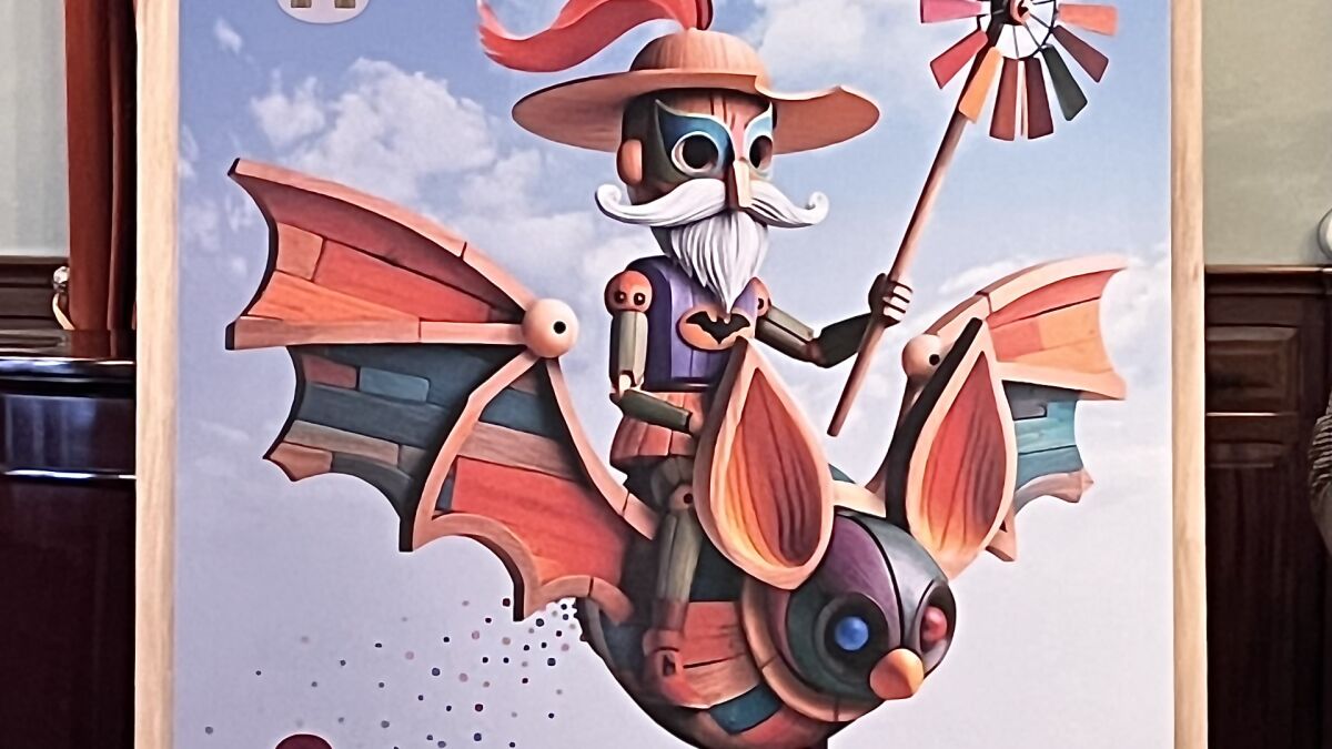 Don Quijote representado al más puro estilo Batman, galopando sobre el murciélago que la ciudad tiene en su escudo, es la imagen que presenta el Carnaval de Albacete 2024 con el título "Volando voy".