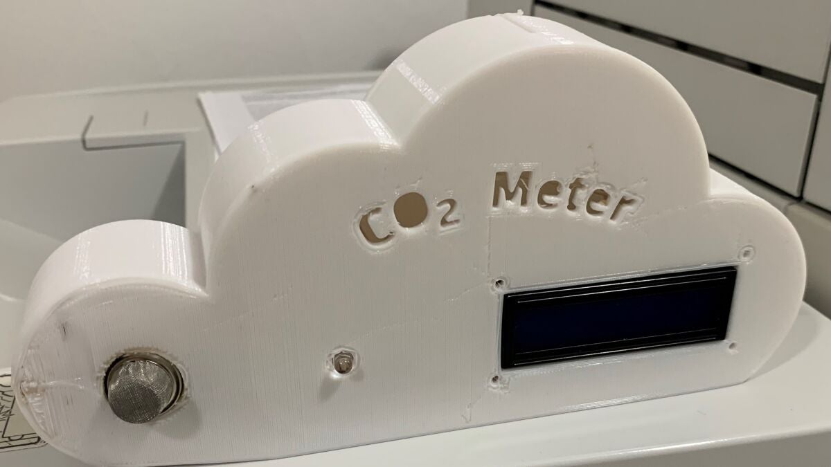 El medidor consta de una pantalla LCD donde se muestra la concentración de CO2 del ambiente y un LED que actúa a modo de alarma luminosa cuando la concentración sobrepasa de 800 ppm, todo ello implementado en una carcasa con forma de nube.