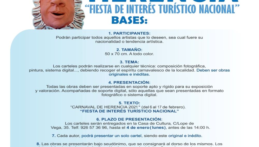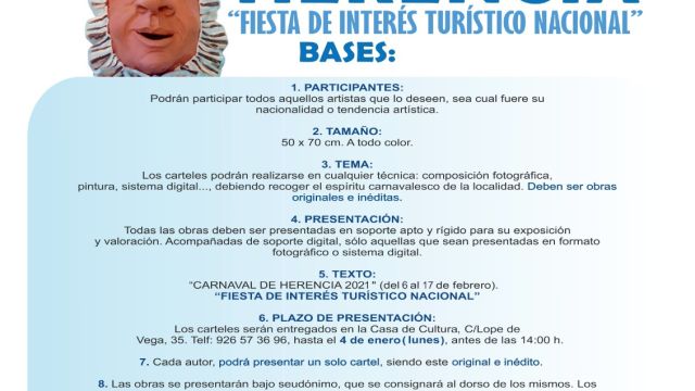 Este concurso está abierto a todos aquellos artistas que lo deseen, presentando obras de tamaño 50×70 cm., a todo color y realizadas en cualquier técnica, debiendo recoger el espíritu carnavalesco de la localidad, datos como la fecha (del 6 a la 17 de febrero) o el título “Carnaval de Herencia 2021. Fiesta de Interés Turístico Nacional.”