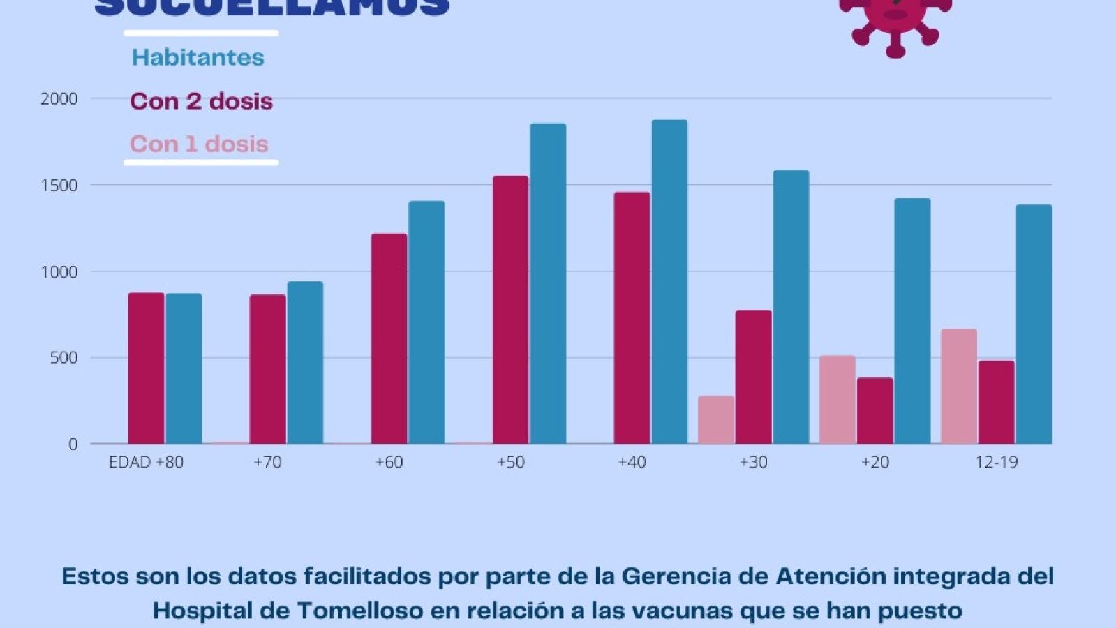 Estos datos recogen a la población de 12 años en adelante, pero no se incluyen los Profesionales de Educación, Cuerpos y Fuerzas de Seguridad del Estado, Protección Civil o Sanitarios que se han vacunado en diferentes Hospitales o Centros designados por la Consejería de Sanidad; no obstante, sí están incluidas algunas personas que están desplazadas en nuestro municipio por motivos de trabajo u otros y que no constan en el censo de la localidad. Igualmente, a las personas que han padecido el COVID solo se les ha puesto 1 dosis y se considera que tienen la pauta completa.