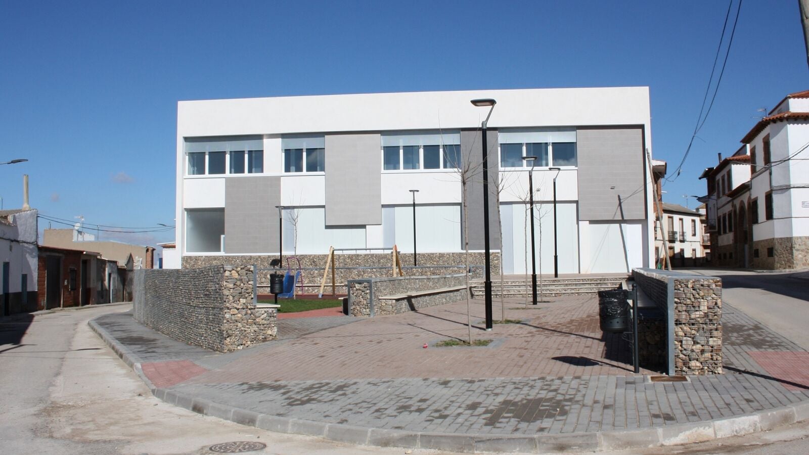Esta especie de plaza está situada en la parte delantera del edificio polifuncional que también se ha construido en la zona y que estará dedicado a almacén municipal, sede de Protección Civil y despachos para emprendedores.