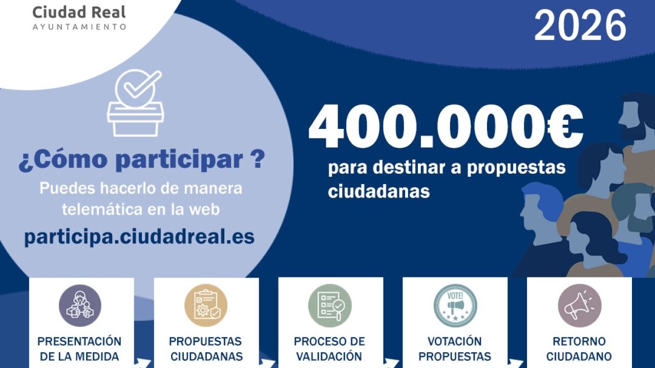 En su presupuesto de 2026 el Ayuntamiento de Ciudad Real dedicará 400.000 euros a la ejecución de los proyectos que presenten y decidan los propios habitantes de la capital. Esa es la propuesta que hoy ha presentado el alcalde, Francisco Cañizares, para hacer realidad por primera vez unos presupuestos participativos.