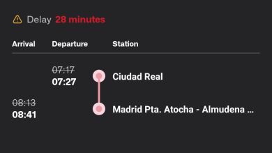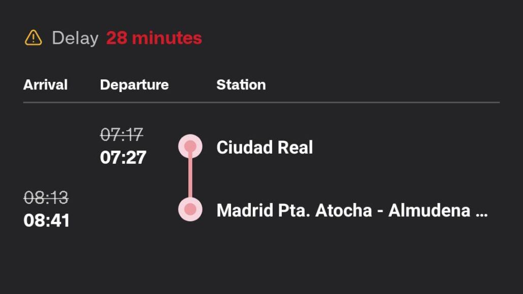 Por ejemplo, el Avant que tenía que haber salido de Ciudad Real a las 7:17 horas lo ha hecho 10 minutos tarde y ha llegado a la estación de Madrid con casi media hora de retraso.