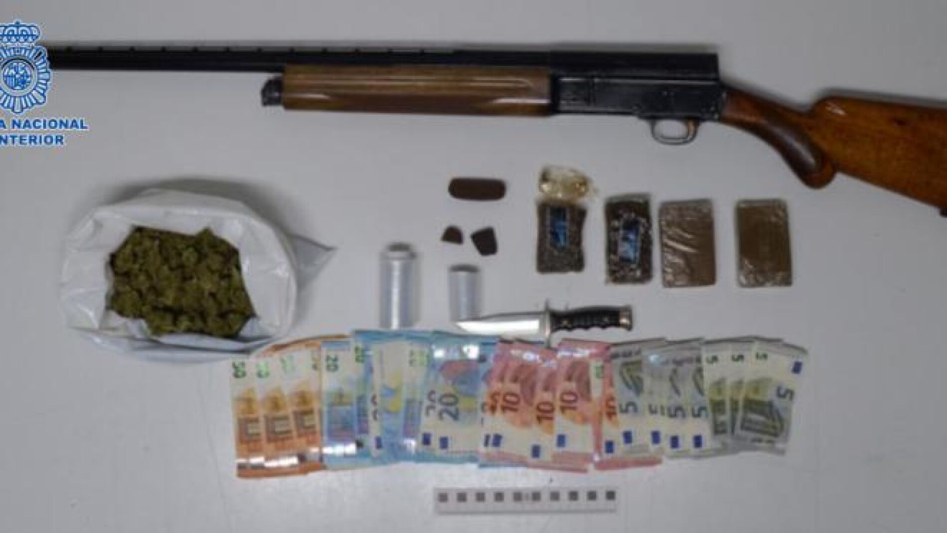 Finalmente, se procedió al registro de la vivienda, donde se detuvo al responsable y se decomisaron un total de 105 gramos de marihuana, 401 gramos de hachís, 505 euros en billetes fraccionados, útiles para la venta de estupefacientes y un arma de fuego semiautomática marca Browning presumiblemente dispuesta para la defensa del referido punto de venta.