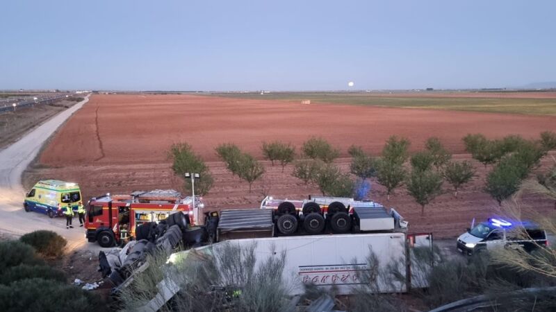 La cabina del camión quedó atrapada y tuvieron que ser los bomberos los que rescataron al conductor, un varón de 44 años que fue trasladado al Hospital de Tomelloso con politraumatismos en una UVI móvil.